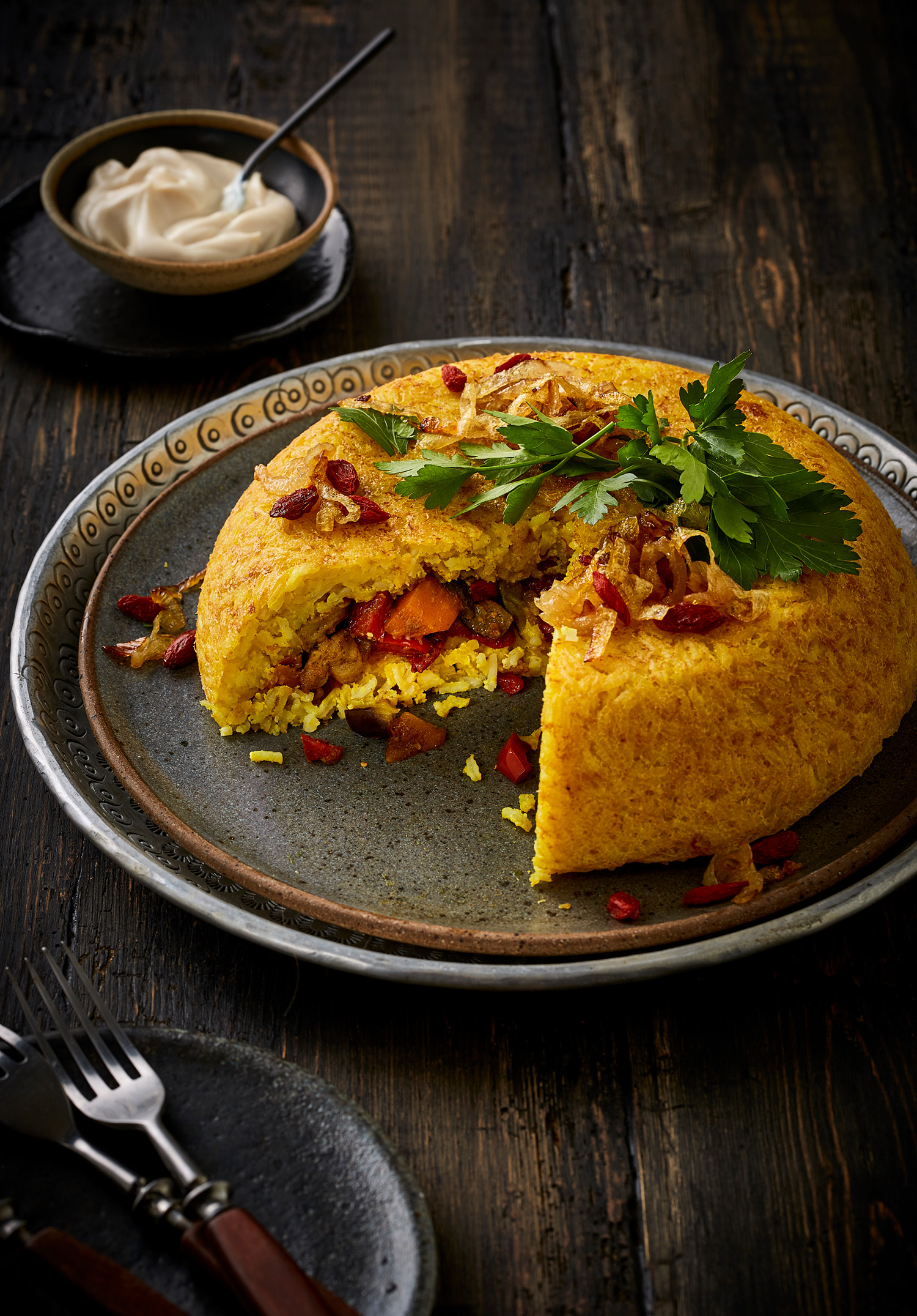 - Return pan to medium heat and cook until you hear the rice sizzle, reduce heat to medium-low and cook for a further 8-10 minutes. Remove from heat and transfer to oven and bake for 45 minutes or until rice appears set and lightly browned. Cool in pan for 10 minutes and then turn onto a serving platter. Top with caramelised onions, parsley and remaining goji berries.