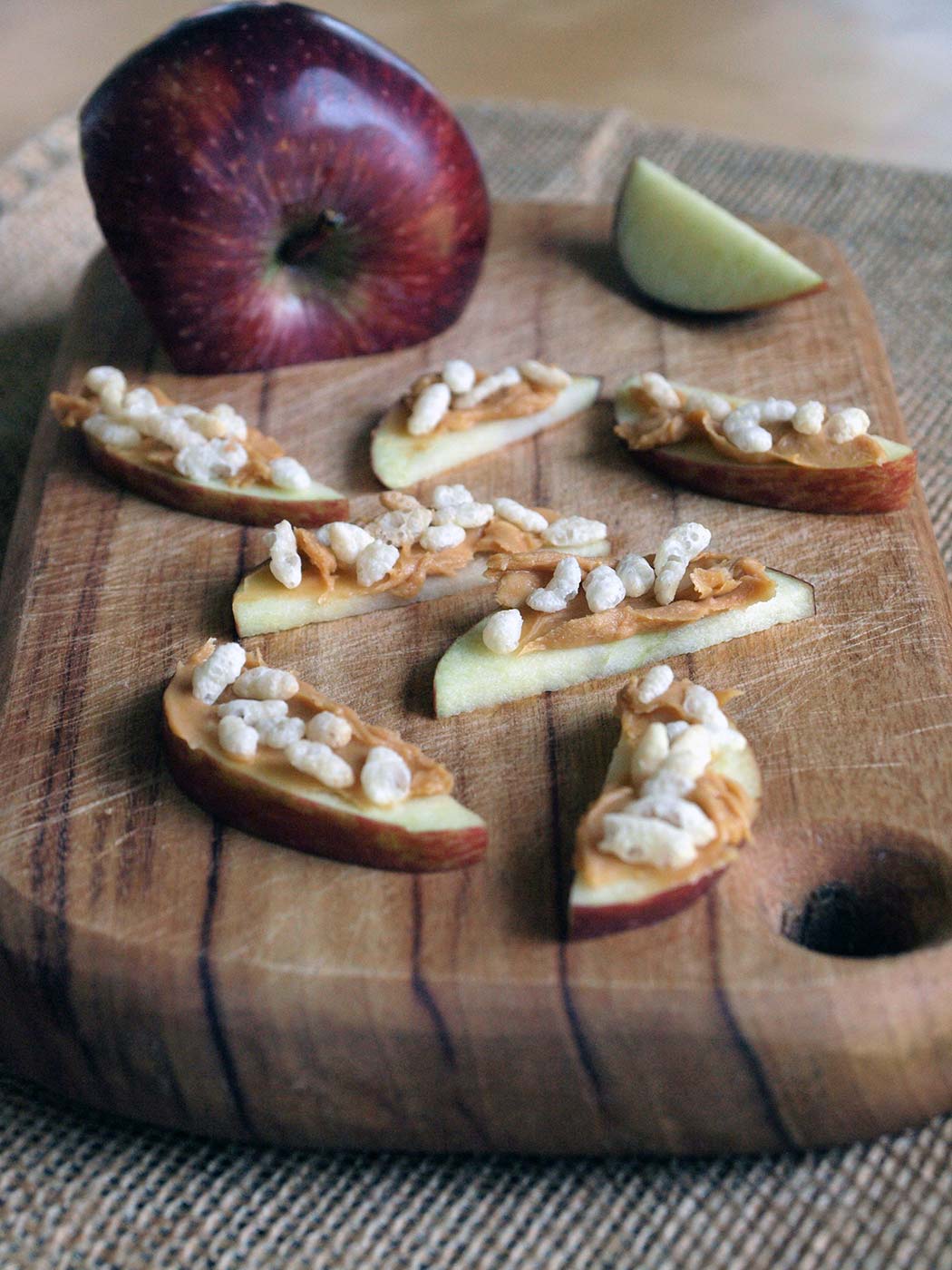- Spread the mixture onto the apple wedges using a knife, then sprinkle with rice puffs and serve. They're best made just before eating.
