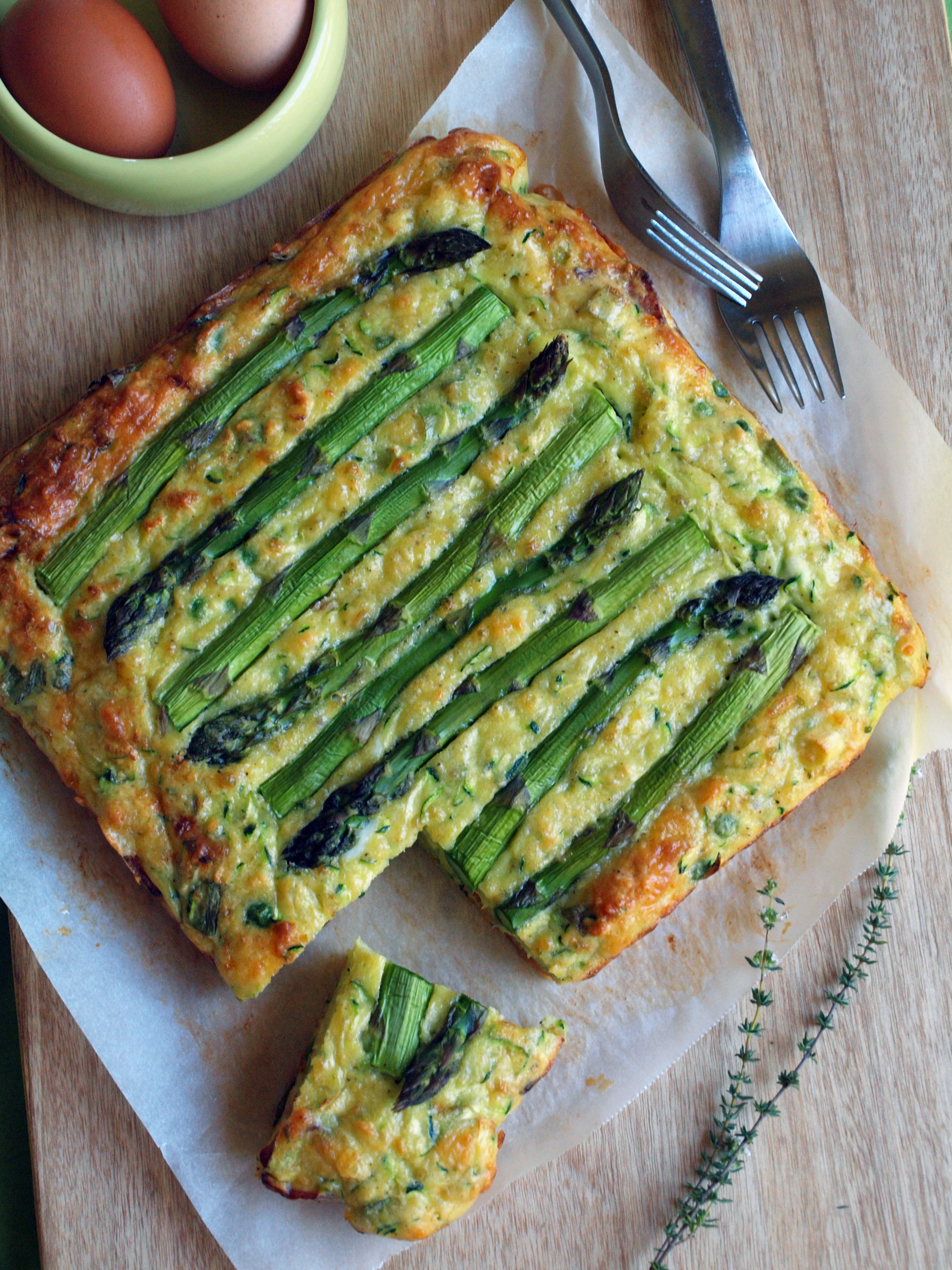 - Pour into the slice tin and smooth the top. Lay the asparagus slices on top and bake for 30-35 minutes until golden and set. Cool in the tin for 10 minutes before slicing and serving warm. It can also be served at room temperature or cold.