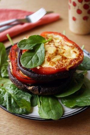 - To serve, place a handful of baby spinach leaves on to each plate then top with two mushrooms and capsicum eggs layered alternately. Drizzle with a little olive oil and serve immediately.
