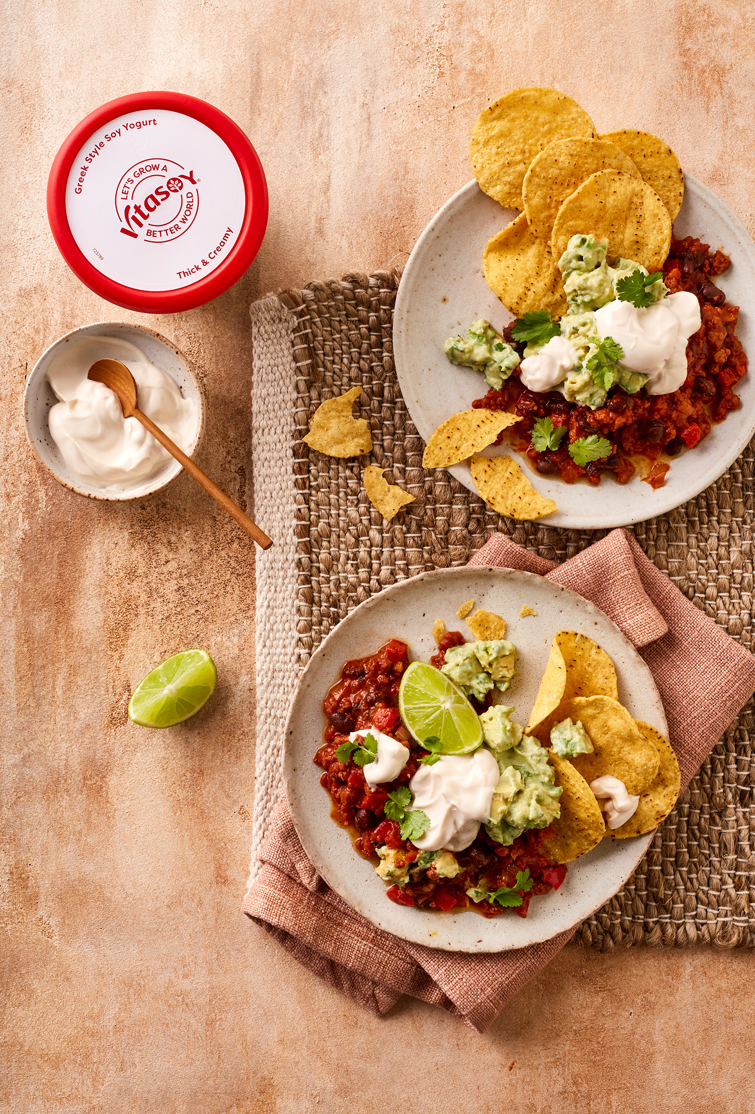 - Roughly mash avocado and mix with yogurt, coriander and lime. Serve chilli dolloped with yogurt, avocado and corn chips.