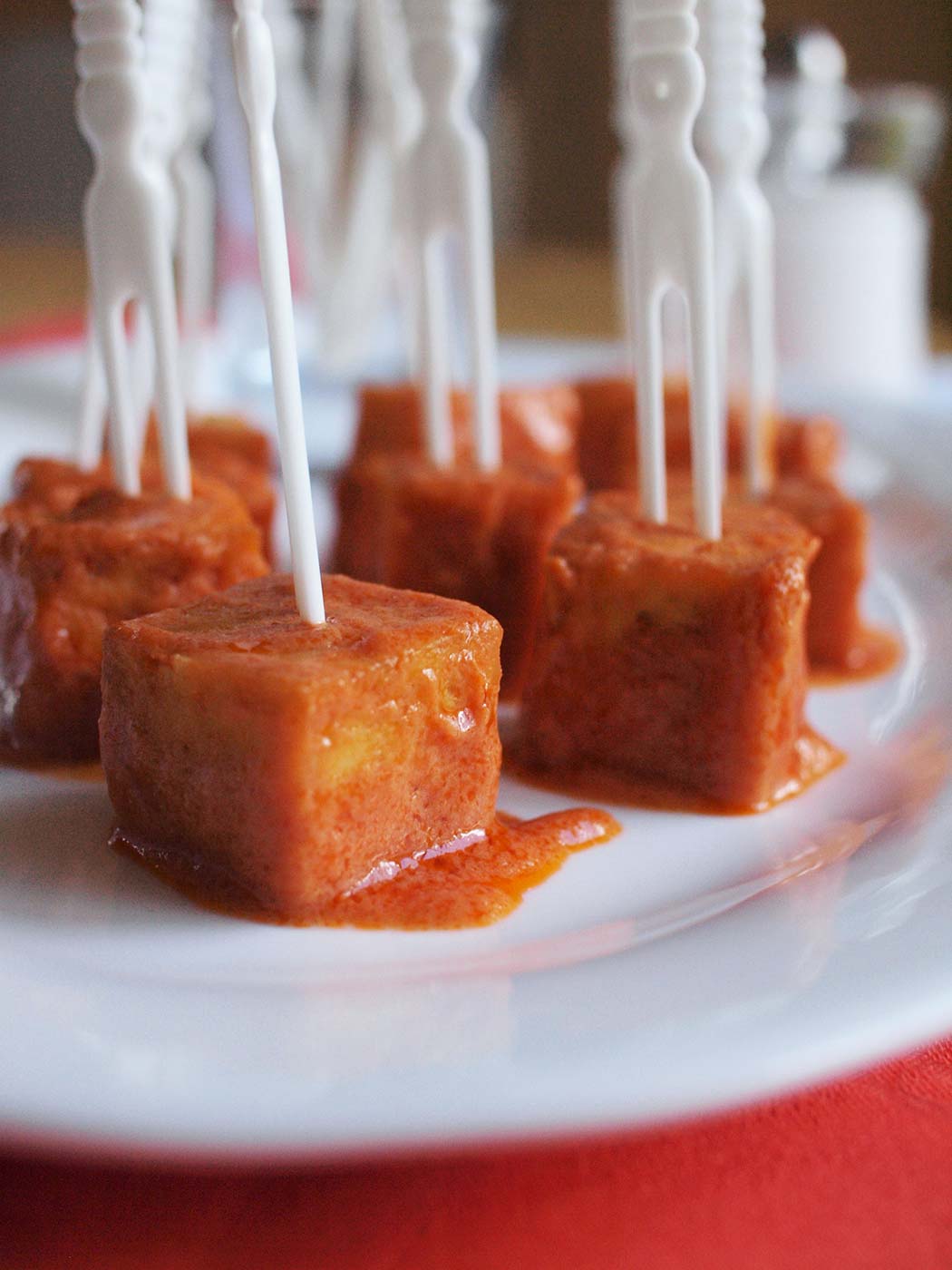 - Transfer the tofu to a serving platter and pour over the glaze. Serve immediately with toothpicks as a canape or with rice and greens as a main meal.