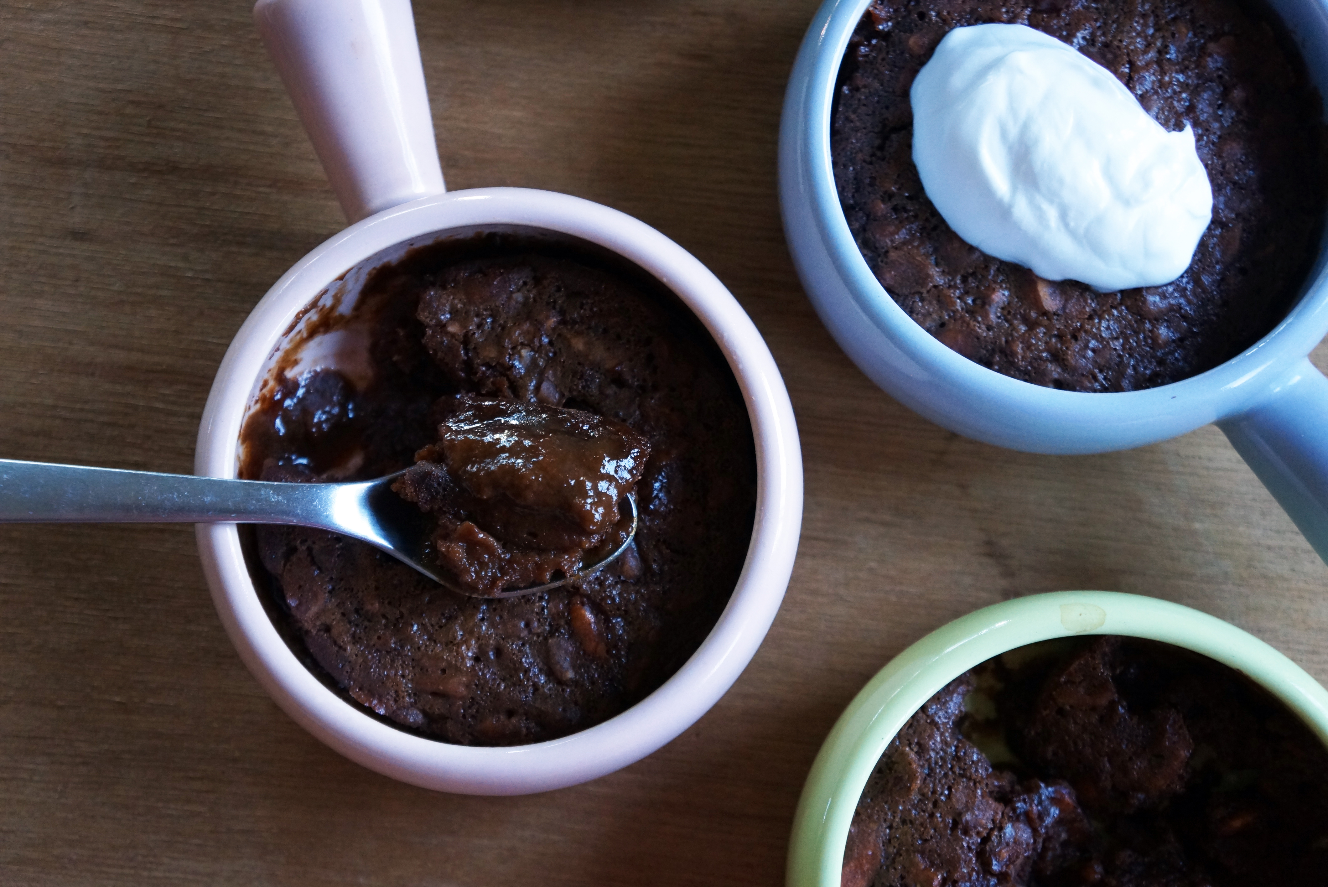 - Whisk together the rapadura sugar, cacao and boiling water in another small jug until the sugar dissolves. Pour evenly between the ramekins. This will sink to the bottom of the batter and form the sauce. Bake for 20 minutes and serve hot with a scoop of coconut yoghurt to keep it dairy free, or ice cream.