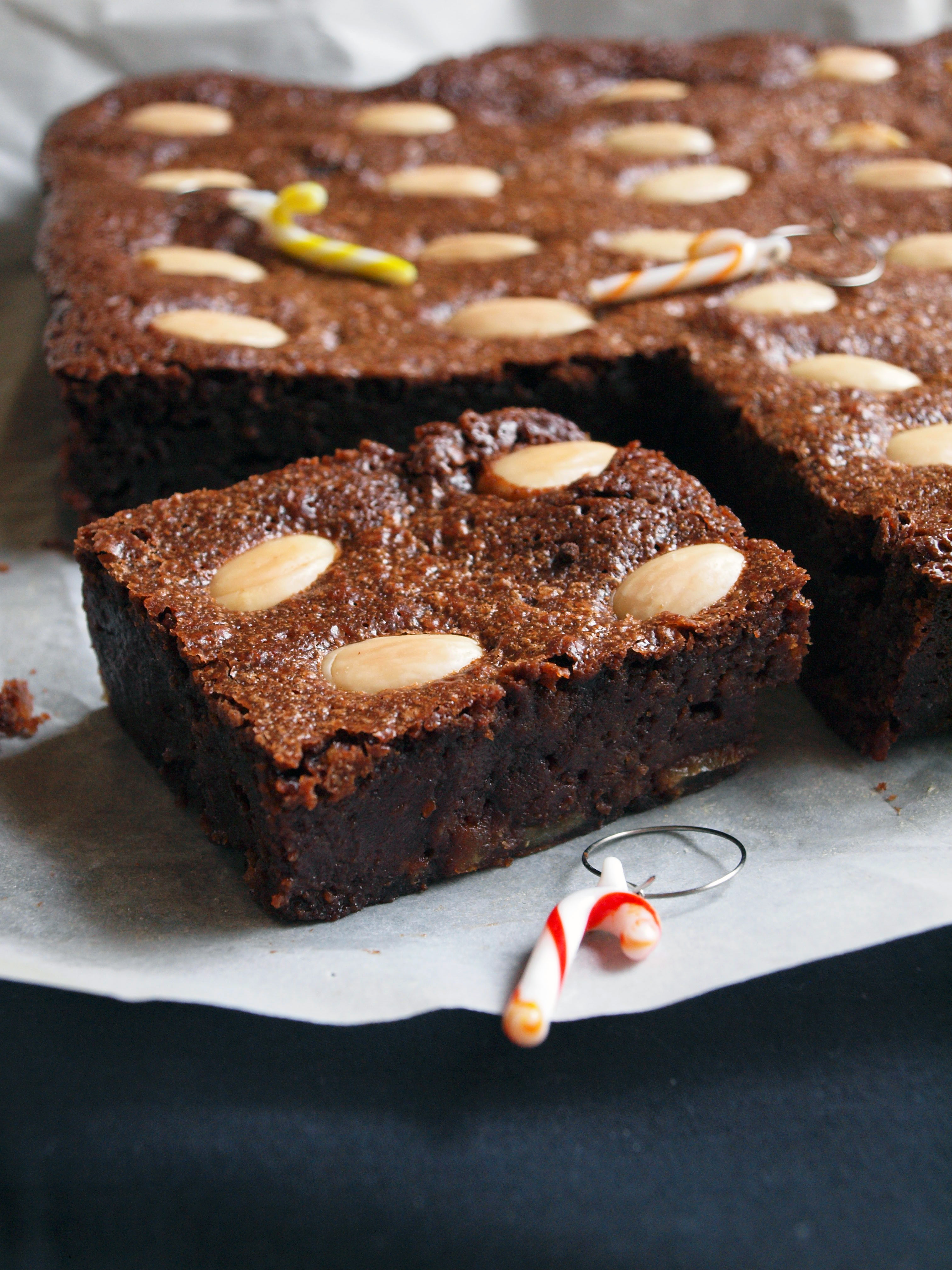 - Pour into prepared tin and smooth the top. Garnish with blanched almonds and bake for 25 minutes until mostly set with a very slight wobble. Allow to cool in the tin until room temperature or chill in the fridge until completely cold. Serve in small squares with coffee or plate up with custard as dessert.