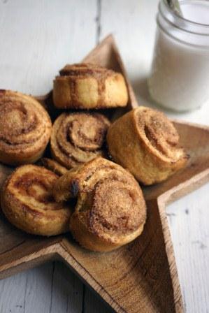 Cinnamon scrolls usually expand into soft fluffy rolls that you pull apart when baked close together, but this is a different take. This recipe bakes them further apart on the tray so that they don't puff up but develop a crunchy crust all the way around. They are best served warm on the day of making, so you'll have to invite some friends around!