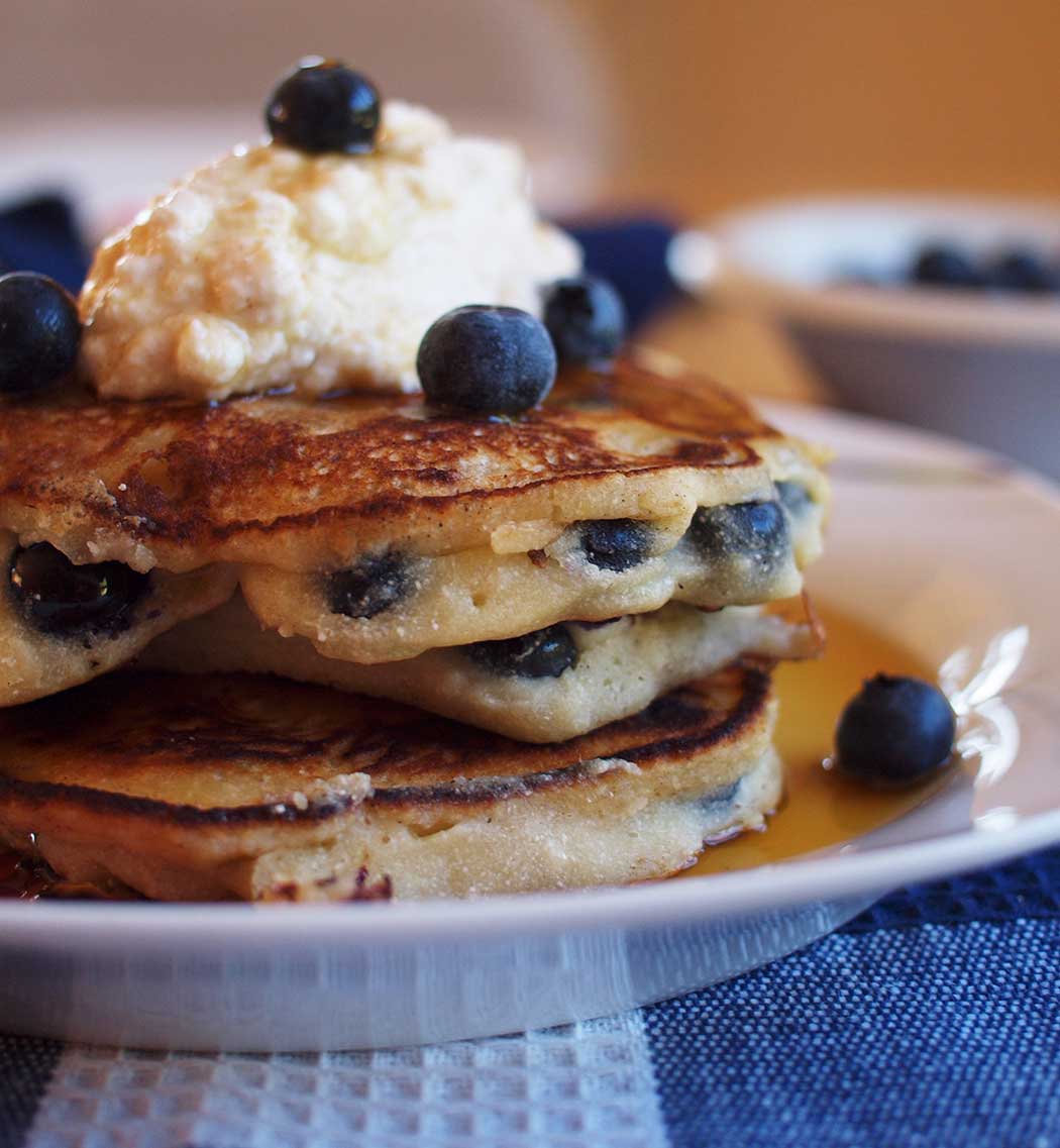 I can buy blueberries in large buckets at my local farmers market when they are in season. While I love to simply eat them out-of-hand, their abundance during the summer months means I have to get creative in the kitchen to finish them off! Enjoy them with extra blueberries and a little drizzle of maple syrup. Yum.