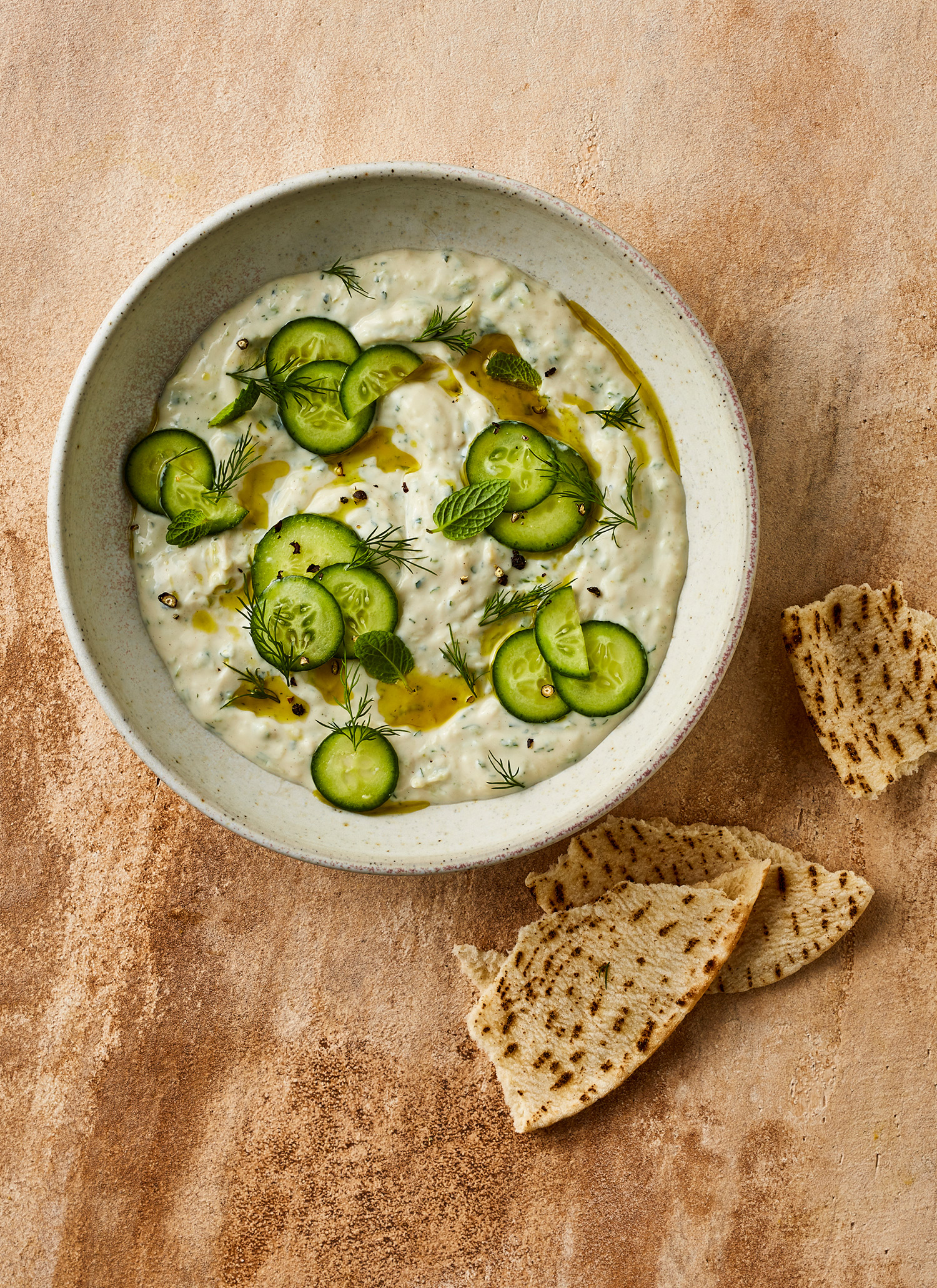 - In a small bowl, combine the cucumber, yogurt, lemon juice, oil, garlic and herbs and season well to taste. Chill until ready to use.