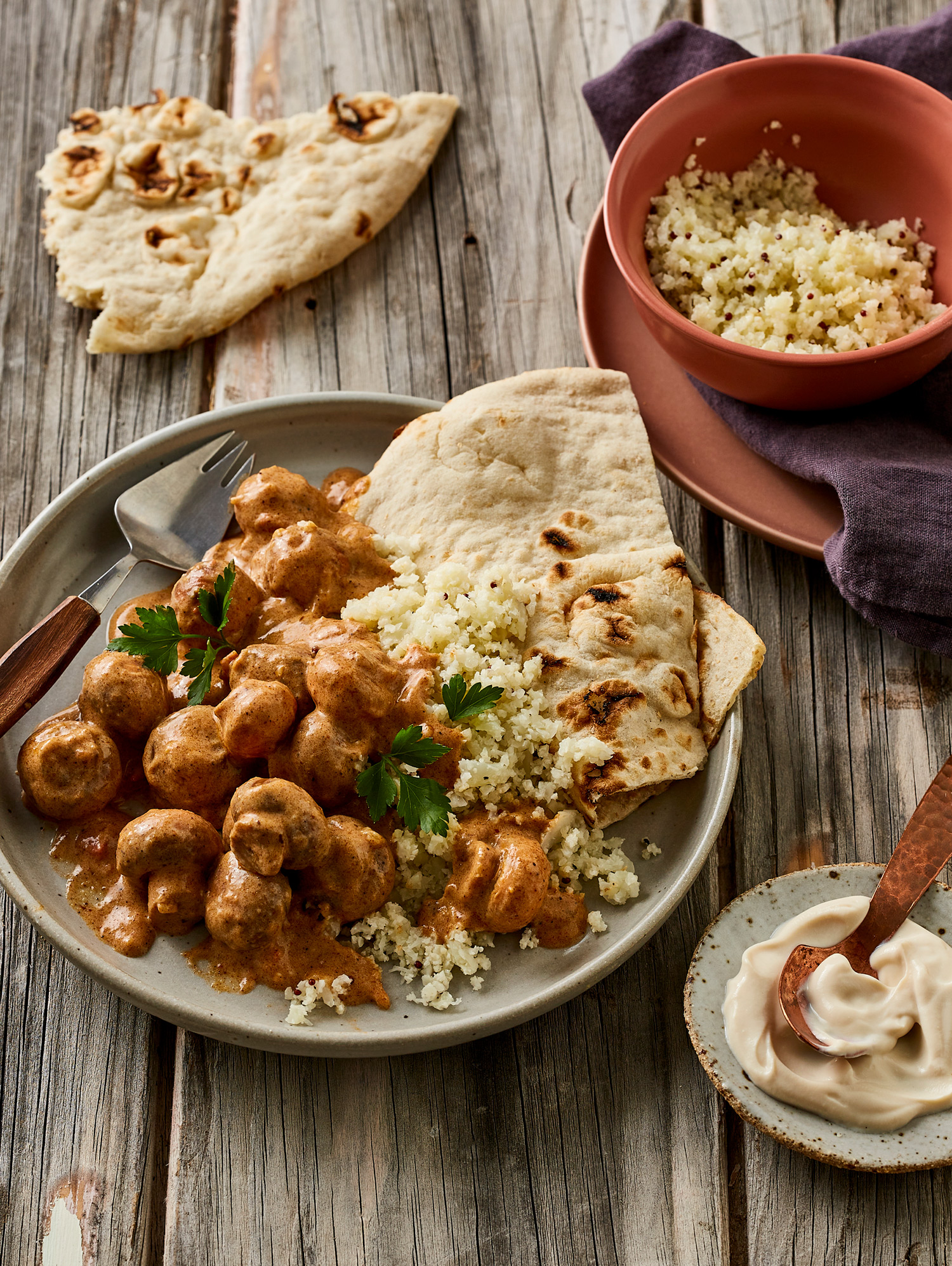 - Heat oil in a large frying pan over medium heat. Add butter chicken paste and cook for 2 minutes or until fragrant. Stir in mushrooms, tomatoes and ¼ cup of water and cook for 8-10 minutes or until mushrooms are coated in spices and just tender. Add yogurt and an extra ½ cup of water and simmer for a further 5 minutes or until mushrooms are cooked through.