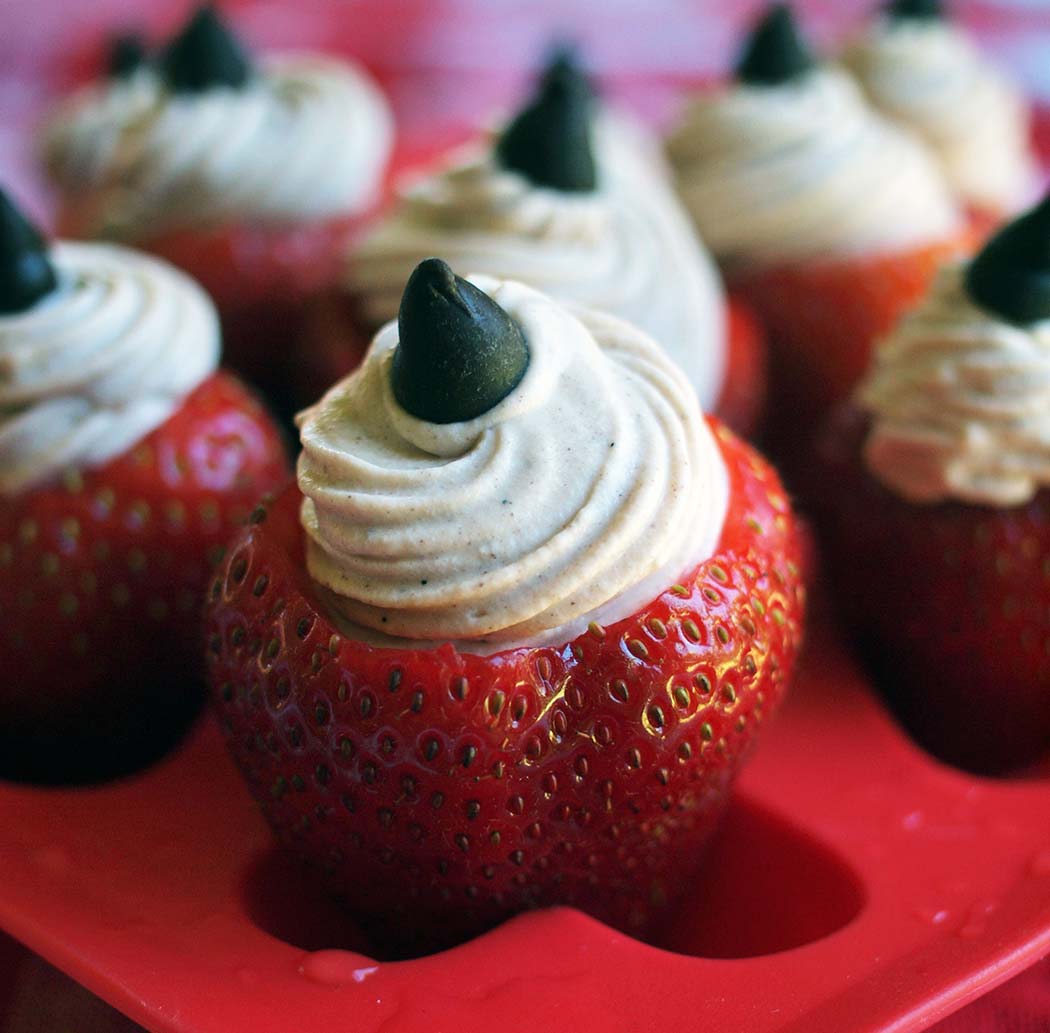 - Wash and dry the strawberries then hull using a small sharp knife or melon baller. Place cut-side up in an ice cube tray and pipe or spoon the mascarpone mixture into each one.