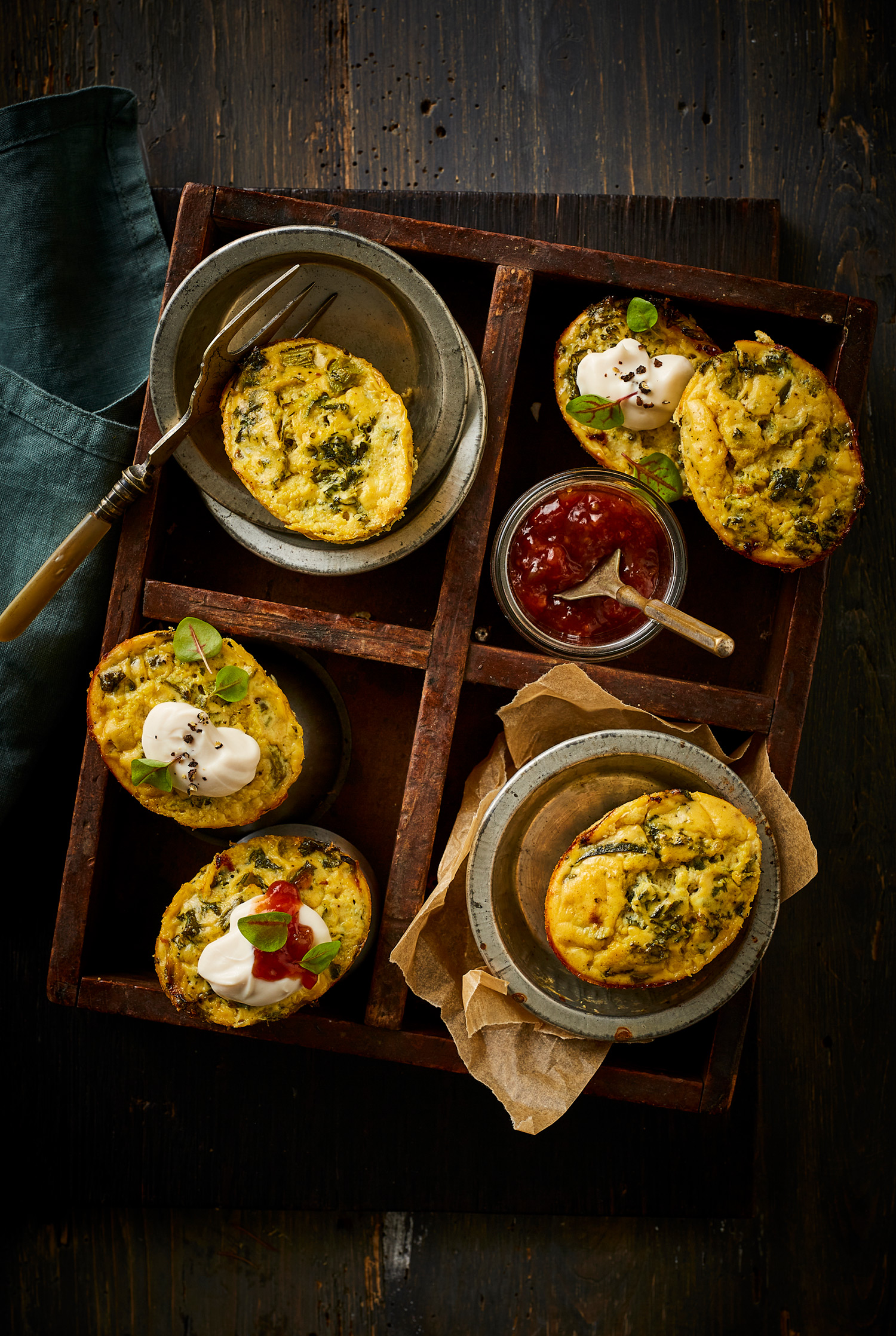 Try serving these dolloped with tomato chutney. Store in the refrigerator for up to 5 days. Tip: Nutritional Yeast flakes add a slightly cheesy, savoury flavour to these frittatas as well as nutritional benefits. Available at most leading supermarkets and health food stores. You could use Parmesan cheese instead (same quantity).