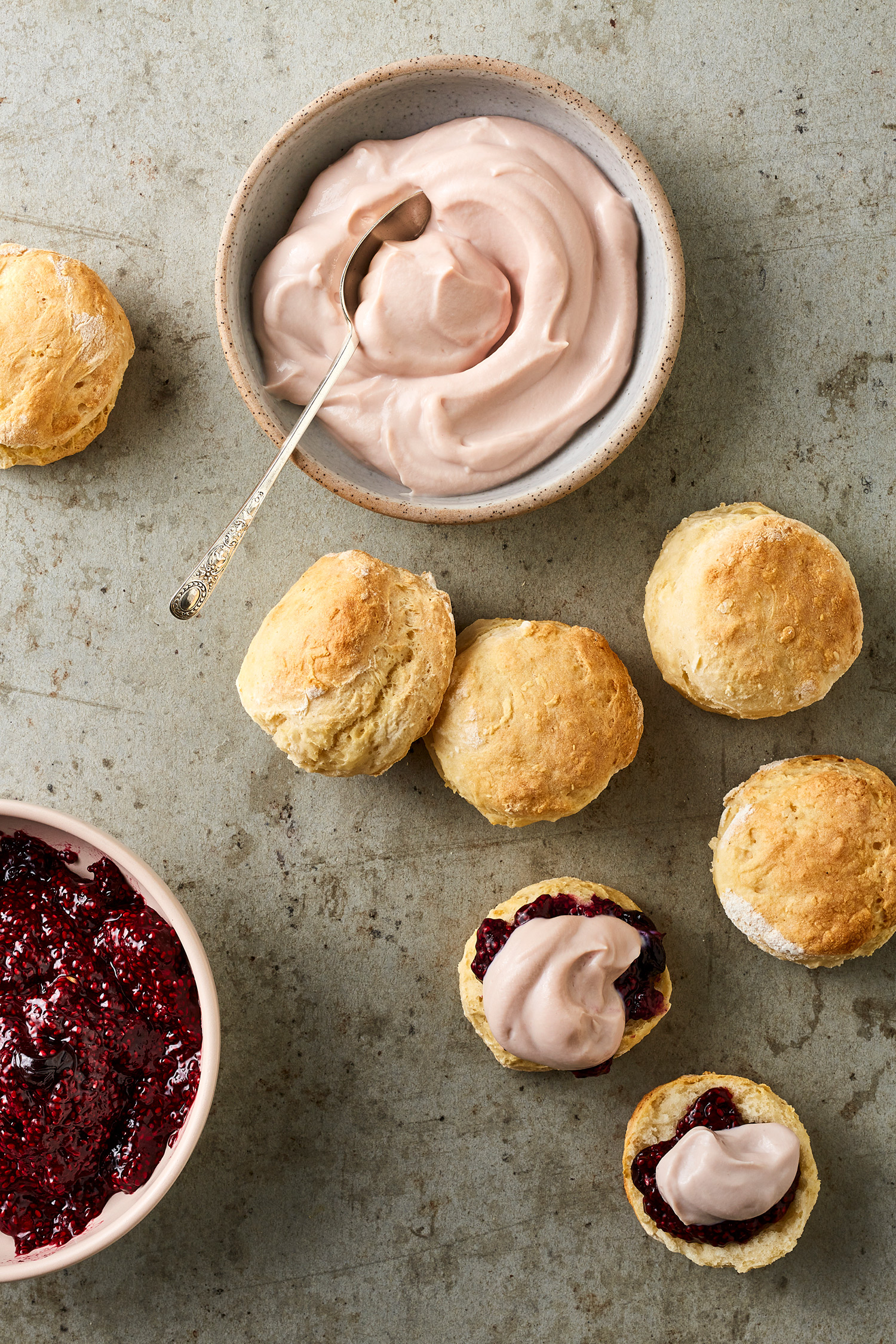 - To serve, split scones and serve with Berry jam and dollops of strawberry yogurt.