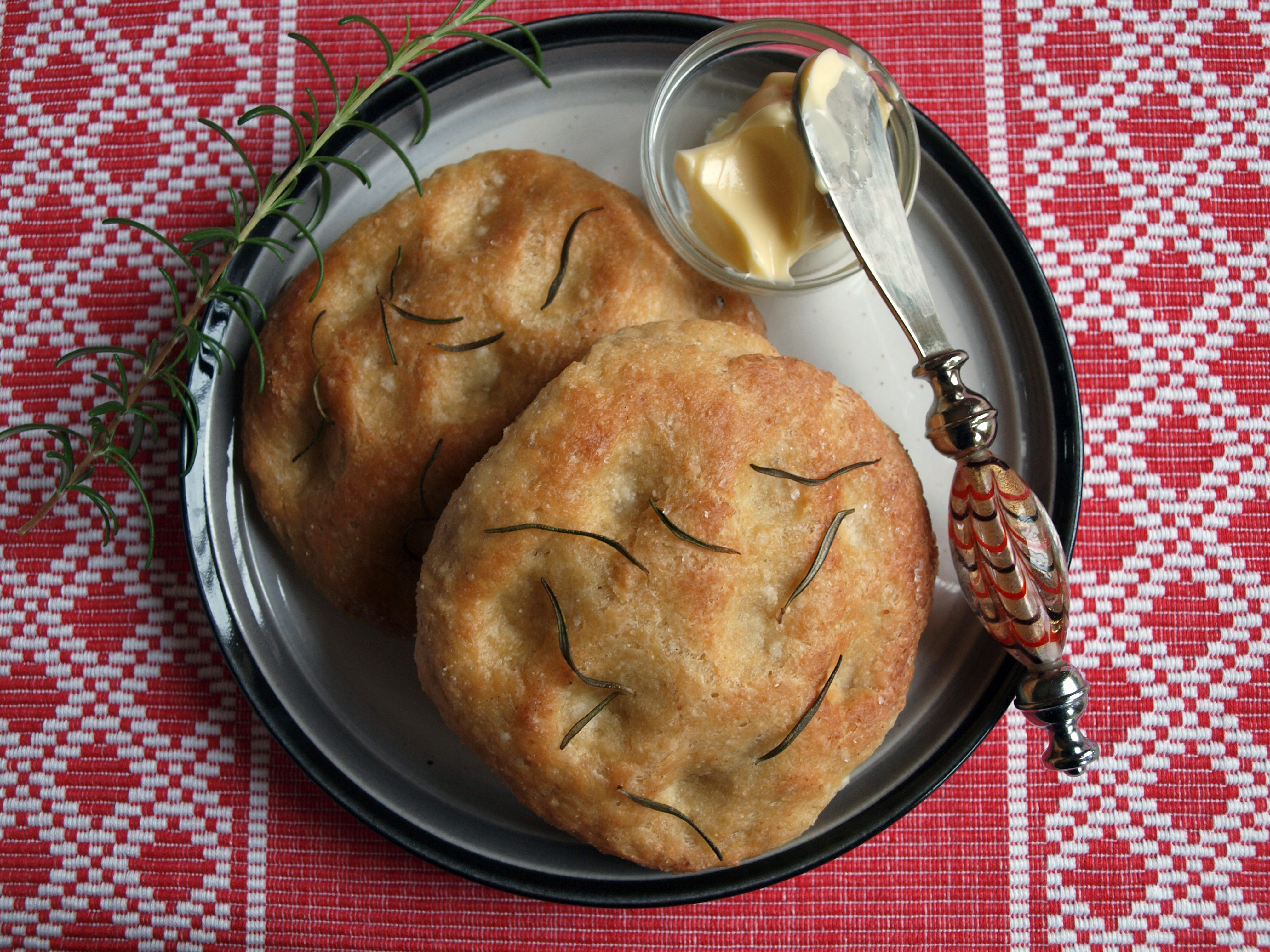 - Use your finger to press 5-6 dimples into each roll, shaping them into rustic slabs. Brush with the remaining 4 tablespoons of olive oil and sprinkle with rosemary leaves. Bake for 5 minutes then turn the oven down to 200C and bake for a further 10 minutes until golden brown. Enjoy warm or cool on a wire rack. Best served the day they are made or toasted the next day.