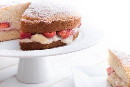 The strawberry and custard flavours in this sponge cake complement each other very well, making it a tasty treat during the day or an impressive dessert!