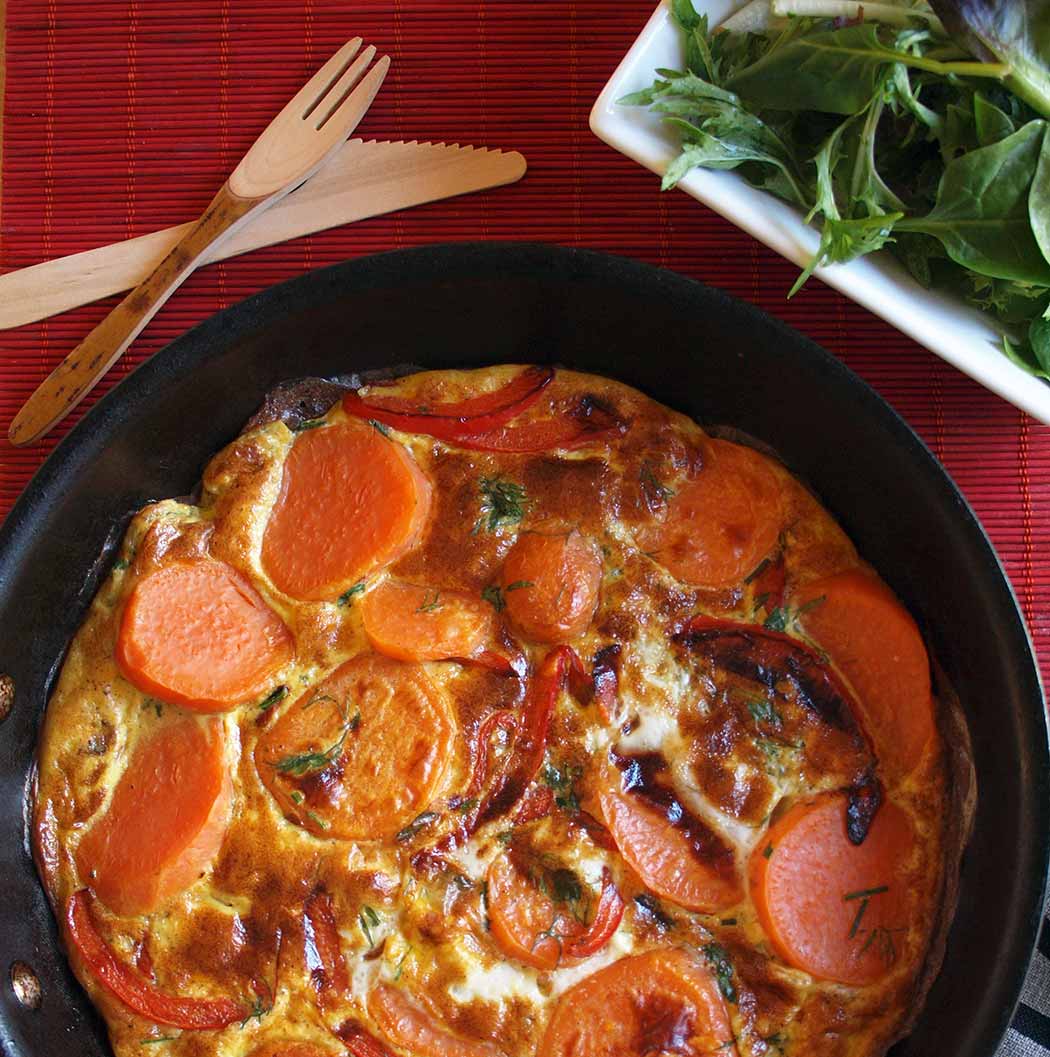 Frittata recipes are brilliant to have on hand for a quick lunch or dinner. This one uses sweet potato and capsicum, but feel free to substitute anything that you have on hand - potato, pumpkin, beans or asparagus when in season all work well. Or if you don't have any fresh veg in the fridge, simply use frozen peas and a meal is only a few minutes away. Enjoy!