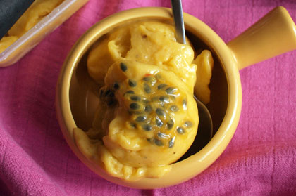 - Serve immediately for the perfect soft sorbet texture topped with fresh passionfruit. If preferred, transfer to a plastic container and freeze until ready to serve, however you will need to sit the container at room temperature for 10 minutes or so to soften before it becomes soft enough to scoop.