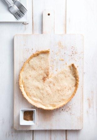 - Spray a 20cm quiche tin with oil and press the shortcrust pastry evenly to the corners and up to the rim.