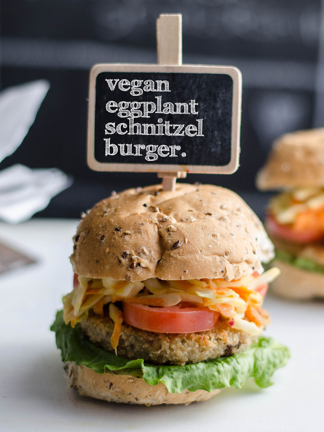 - Once the 6 eggplant rounds have been grilled or fried, arrange your burger. On a bread roll add the lettuce leaves, an eggplant schnitzel, tomato slices and the coleslaw and serve!