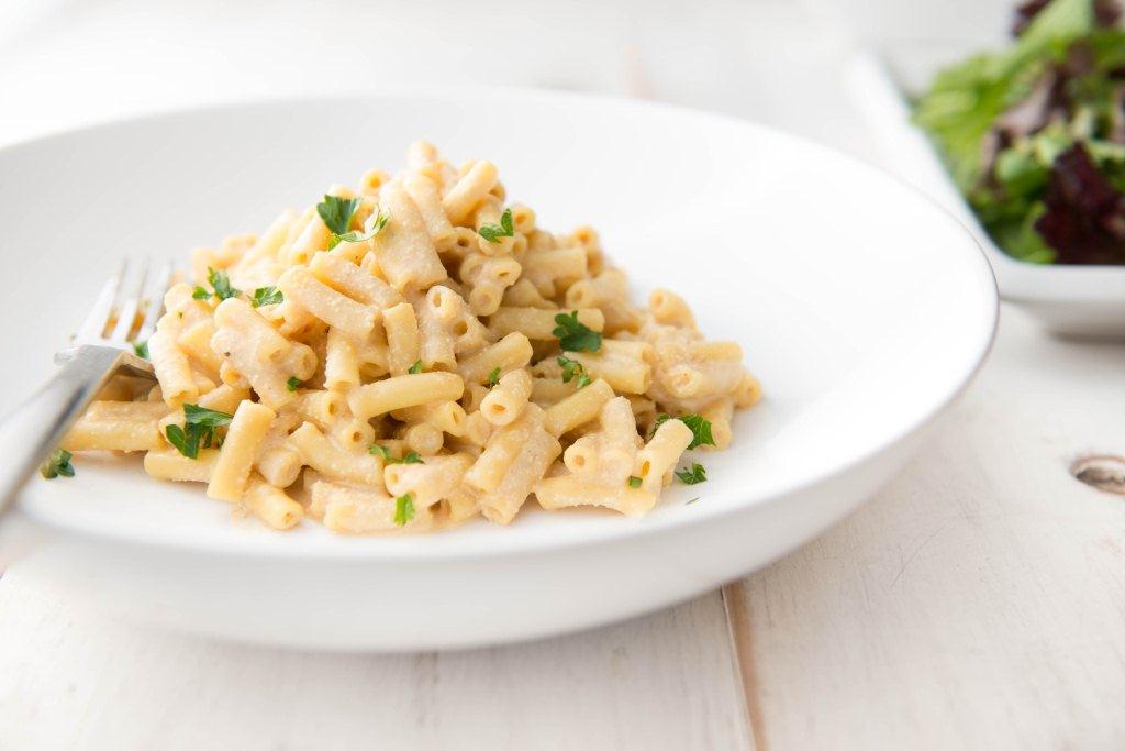 - In a food processor or blender, blend the cashews, soy milk, nutritional yeast, salt and pepper, corn flour, dijon mustard, lemon juice, tahini, smoked paprika and garlic. Blend until smooth and creamy. Taste, and season with more salt and pepper as needed.