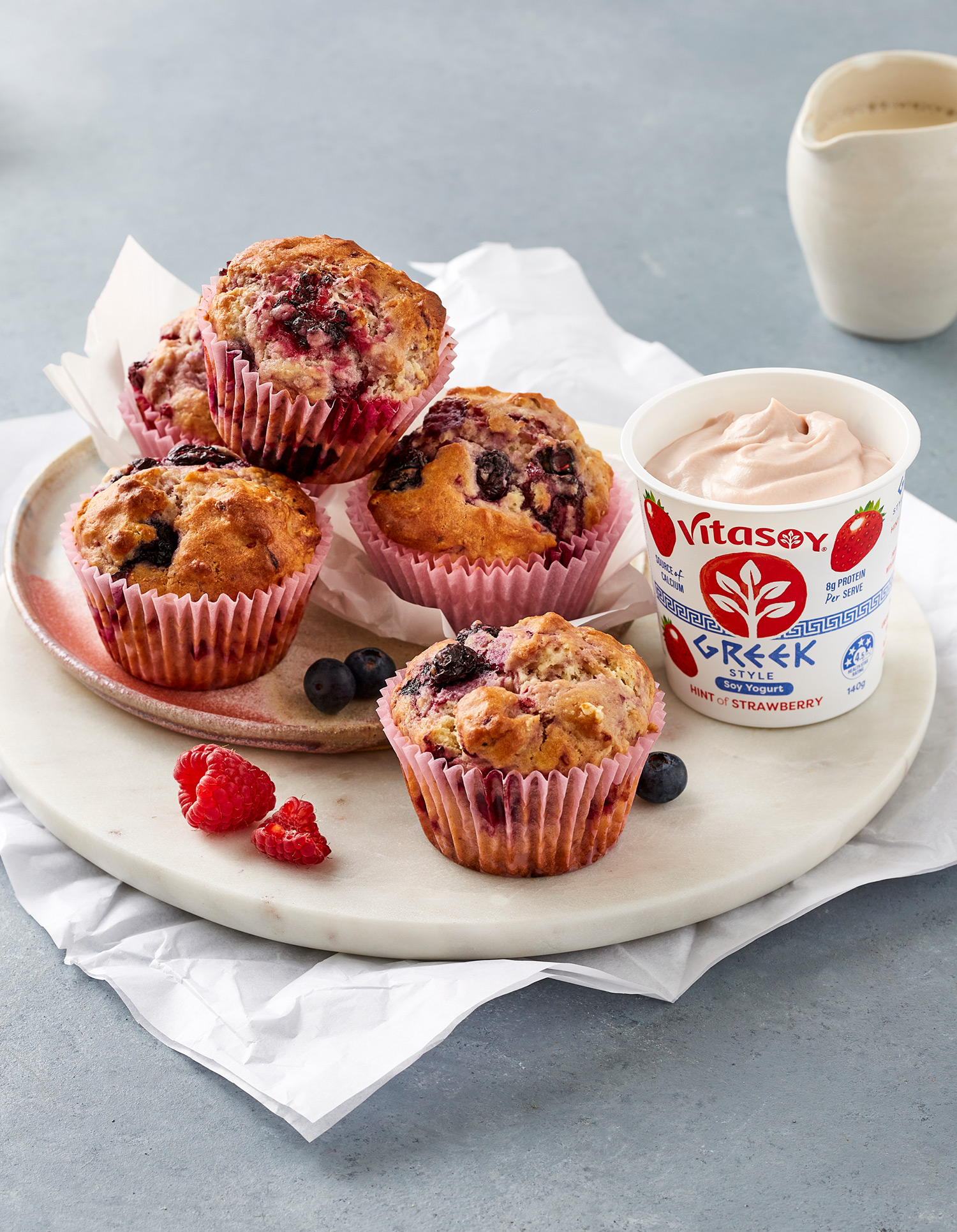 - Combine flour and sugar in a large bowl. Combine eggs, oil, yogurt and milk in a separate jug. Add wet ingredients to the dry and stir until just combined. Fold in berries.