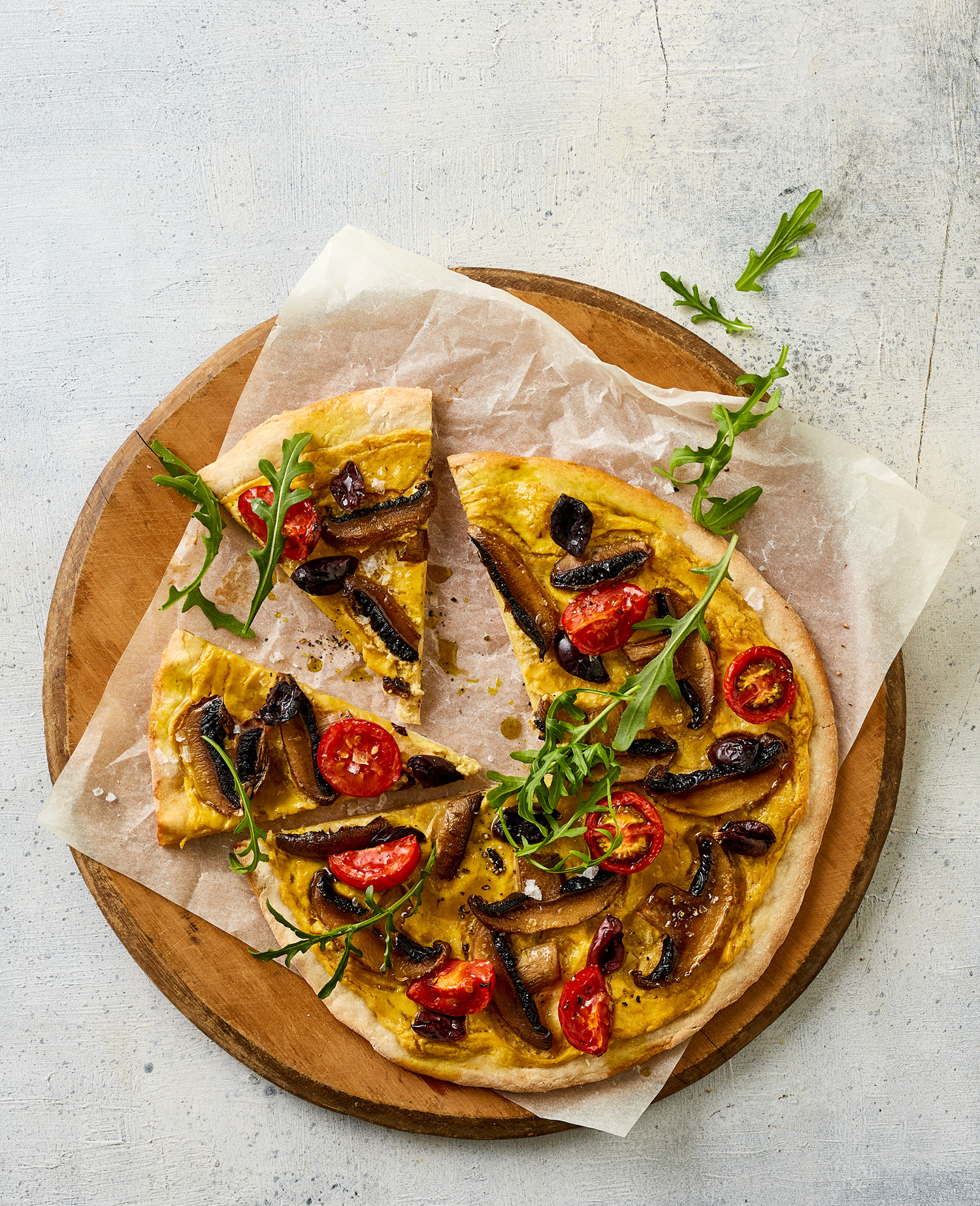 - Combine extra yogurt and nutritional yeast and spread over pizza bases. Top evenly with mushrooms, tomatoes and olives. Drizzle with olive oil.
